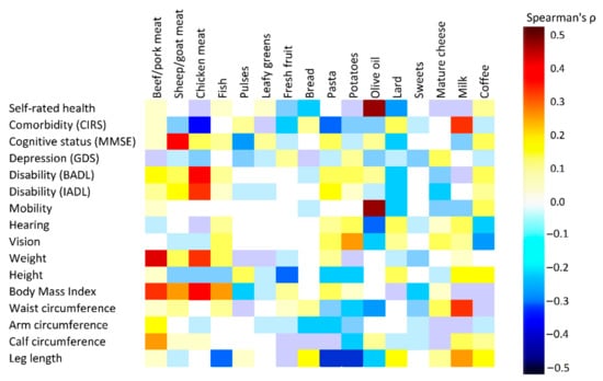 The Spearman correlations between foods frequency changes and a panel of health indicators is illustrated in Figure 4 and Table S4 of the Supplementary Materials. For the overall indicators of health, the major significant positive correlation was detected between self-rate health and increased consumption of olive oil (ρ = 0.519, p < 0.0001), and negative with lard (ρ = −0.249, p = 0.030). The CIRS score correlated positively with milk (ρ = 0.300, p = 0.008) whereas the association was inverse (the number of diseases increased), with pasta (ρ = −0.331, p = 0.003) and chicken meat (ρ = −0.424, p < 0.0001) consumption. Cognitive status (measured through MMSE score) was positively associated only with sheep/goat meat (ρ = 0.358, p = 0.006), while it was negatively associated with pulse consumption (ρ = −0.259, p = 0.050) albeit not significantly. A higher GDS score (associated with a worse affective status) was inversely correlated with chicken meat consumption (ρ = −0.186), again without reaching statistical significance. The score for basic activities of daily living significantly improved with meat intake (ρ = 0.208, p = 0.025; ρ = 0.175, n.s.; and ρ = 0.351, p = 0.002, for beef/pork, sheep/goat and chicken, respectively). In the case of more demanding instrumental activities, a positive association was observed with sheep/goat meat (ρ = 0.229, p = 0.047) and chicken meat (ρ = 0.333, p = 0.003), and negatively with lard (ρ = −0.236, p = 0.040) and mature cheese (ρ = −0.237, p = 0.039). Better scores in physical performance tests were detected only in association with olive oil (ρ = 0.502, p < 0.0001) intake. As for vision and hearing, an inverse association was observed with olive oil (i.e., a greater consumption resulted in less incapacity), and for vision only, a direct association with potato consumption. The associations of dietary intake with anthropometric indicators were more complex and can be summarized as follows: weight, height and BMI correlated above all with meat and fish intake. Limb circumferences were strongly correlated with beef meat, and for calf circumference only, inversely with potato consumption. In the Supplementary Material these correlations are reported separately in males and females.