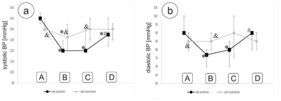 Systolic (a) and diastolic (b) office blood pressure throughout the study. * p < 0,05 vs. stage A; # p < 0,05 vs. stage C; and & p < 0.05 between groups. Description of stages A–D of the study is shown in Figure 2.