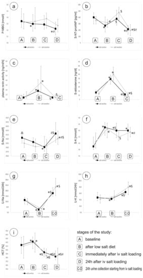 Changes in plasma MBG concentration (a) and serum NT-proANP (b) concentrations, PRA (c), serum aldosterone (d), sodium (e) and potassium (f) concentrations, urinary sodium (g) and potassium (h) excretion, and hematocrit (i), throughout the study. * p < 0,05 vs. stage A; $ p < 0,05 vs. stage B; # p < 0,05 vs. stage C; and & p < 0.05 between groups.