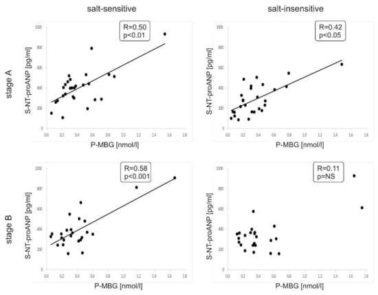 Correlation between plasma MBG and serum NT-pro ANP concentrations at baseline (stage A; upper panels) and after sodium restriction (stage B; lower panels) in salt-sensitive and salt-insensitive groups, respectively.