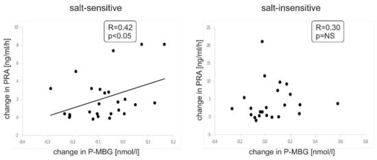 Correlation between changes in plasma MBG (p-MBG) from baseline to the end of salt restriction and changes in plasma renin activity (PRA) from baseline to the end of salt restriction in salt-sensitive and salt-insensitive groups, respectively.