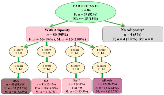 Classification of participants according to body composition compartments. * Participants had both osteoporosis and sarcopenia, but because of a small number they were not analyzed further. ** Participant with only SA were not analyzed further because of a small number. Different criteria are used for determination of osteopenia/osteoporosis, sarcopenia, and adiposity for women and men. F—female; M—male; OSA—osteosarcopenic adiposity; OA—osteopenic/osteoporotic adiposity; SA—sarcopenic adiposity; AD—adiposity only.