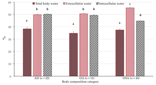 Percent of total body water (TBW), extracellular water (as % of TBW) and intracellular water (as % TBW) in participants according to body composition categories (mean ± standard error). Bars with different letters indicate the statistically significant difference among the groups (ANOVA with a post hoc Scheffe test; p < 0.05). AD—adiposity only; OA—osteopenic/osteoporotic adiposity; OSA—osteosarcopenic adiposity.