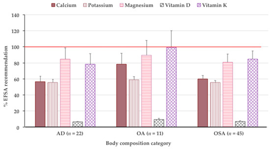 Select minerals and vitamins in reference to EFSA recommendations in participants according to body composition categories (mean ± standard error). ANOVA is not significant. Horizontal red line denotes 100% compliance with recommendations. EFSA—European Food Safety Authority; AD—adiposity only; OA—osteopenic/osteoporotic adiposity; OSA—osteosarcopenic adiposity.