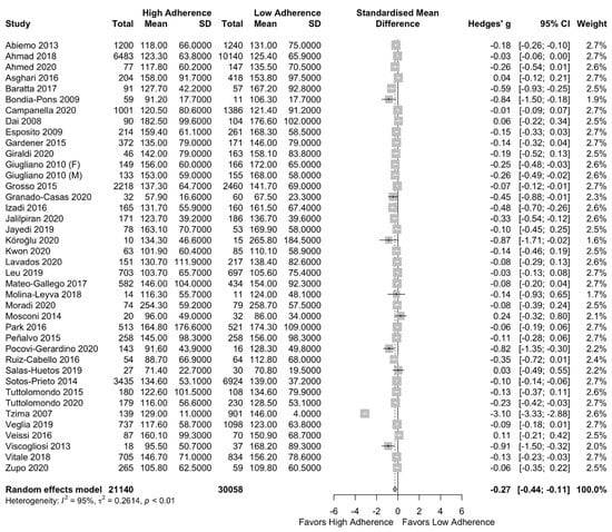 Meta-analysis results can be found in Figure 6. Lower SBP was observed in the high adherence group but not significant (SMD:−0.15 (95% CI: −0.38, 0.07)) with high heterogeneity across the included studies (I2 = 97%). This result did not change after the performance of a subgroup analysis based on the quality of studies (SMD: −0.25 (95%CI: −0.60, 0.10), I2 = 98%) as can be seen in Supplementary Figure S6.