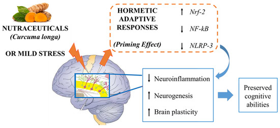 An intriguing hypothesis suggests that nutraceuticals might be perceived as potentially toxicant by the organism (at high doses), however, exposure to low doses of these compounds might stimulate the organism’s hormetic/adaptive responses aimed at counteracting such threats. Likewise, Curcuma longa acting as a mild stress might trigger signaling cascades boosting antioxidant and anti-inflammatory pathways (related to Nrf2, NF-kB, NLRP3), leading to decreased neuroinflammation, increased neurogenesis and brain plasticity, finally improving cognitive abilities. Figure adapted with permission from [87], Copyright © 2014 University of Massachusetts.