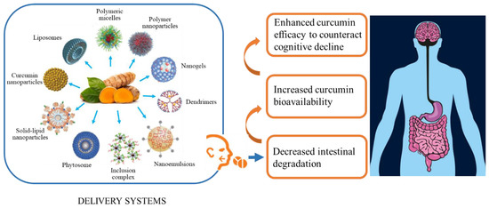 New delivery systems such as polymeric micelles, polymer nanoparticles, nanogels, dendrimers, nanoemul-sions, inclusion complexes, phytosomes, solid-lipid nanoparticles, curcumin nanoparticles and liposomesnanoparticles, liposomes, micelles, nanogel, dendrimers, nanoemulsions, inclusion complexes and phytosomes have the potential to reduce intestinal degradation and increase curcumin bioavailability, ultimately enhancing its efficacy throughout the body and the brain. Within this latter organ the increased curcumin bioavailability might counteract cognitive decline. Figure adapted with permission from [119]. Copyright © 2018, Said Moselhi.