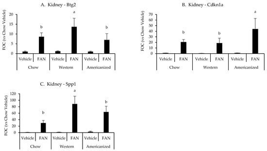 Kidney gene expression data from the diet-FAN study. Data are presented normalized to chow-fed mice with vehicle treatment (average + STD). (A) Kidney—Btg2, (B) Kidney—Cdknla, (C) Kidney—Spp1. Different superscript letters (a vs. b) signify significant difference between diets (p < 0.05) as determined by Two-Way ANOVA with Tukey Post Hoc test. Treatments with similar superscript letters are not statistically different (p > 0.05). RT-PCR data and statistics are presented in Appendix F Table A4. n = 4 for each diet-treatment combination. FOC—fold change.