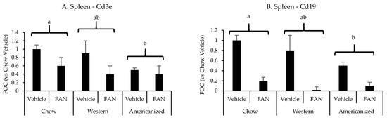 Spleen leukocyte-specific gene expression data from the diet-FAN study. Data are presented normalized to chow-fed mice with vehicle treatment (average + STD). (A) Spleen—Cd3e, (B) Spleen—Cd19. Different superscript letters (a vs. b) signify significant difference between diets (p < 0.05) as determined by Two-Way ANOVA with Tukey Post Hoc test. Treatments with similar superscript letters are not statistically different (p > 0.05). RT-PCR data and statistics are presented in Appendix F Table A4. n = 4 for each diet-treatment combination. FOC—fold change.