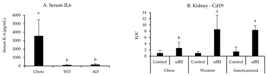 Circulating IL6 and renal Cd19 mRNA expression following uIRI. RT-PCR data are presented normalized to the healthy contralateral kidney in chow-fed mice (average + STD). Different superscript letters (a vs. b) signify significant difference between diets (p < 0.05) as determined by Two-Way ANOVA with Tukey Post Hoc test. Treatments with similar superscript letters are not statistically different (p > 0.05). RT-PCR data and statistics are presented in Appendix G Table A5. n = 4–6 for each diet-treatment combination. FOC—fold change.