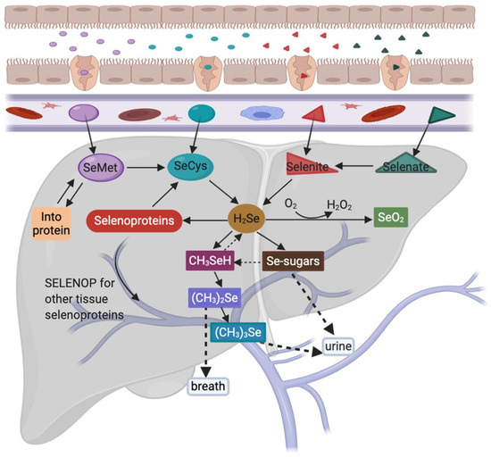 Se levels in a given food product does not mean an organism will derive its correct Se quota—instead, this depends on the bioavailability, bioaccessibility, and/or bioactivity of a given Se compound [2]. Human dietary Se forms mainly include organic and inorganic Se. These forms are typically absorbed without any regulatory processes and have a high bioavailability in the body [2,21]. Se is primarily absorbed in the duodenum and caecum after active transport via a sodium pump, but this process is different depending on the chemical form [22]. After intestinal absorption, different Se forms enter the bloodstream and are transported into the liver via the portal vein, where they are metabolized, transported, and distributed to different tissues [23] (Figure 1, adapted from [24,25,26,27] and drawn with https://app.biorender.com/ access on 1 March 2021). In normal diets, tissue Se concentrations in the body range from the highest to the lowest in the following organs: Kidney, liver, spleen, pancreas, heart, brain, lung, bone, and skeletal muscle [28].