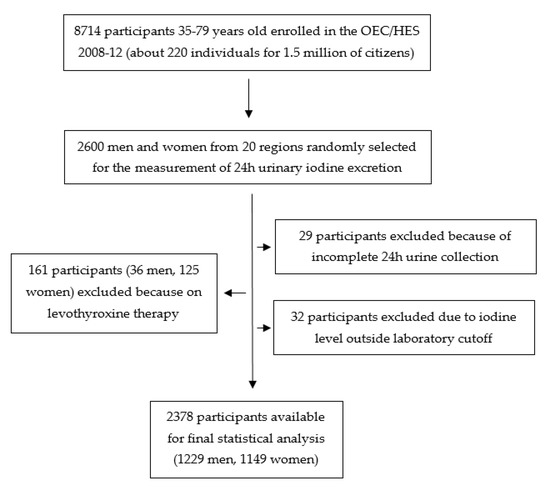 To the purposes of the MINISAL-GIRCSI Programme, 2600 participants, representative of both sexes and all the Italian regions (about 130 participants per region) were randomly selected for the analysis of iodine intake. Twenty-nine subjects were excluded from the analysis because of suspected incomplete 24 h collection (participant report of incomplete urine collection, 24 h urine volume below 500 mL, or creatinine content referred to body weight lower than the mean minus two standard deviations from the population mean [19]). Twenty-four additional subjects were excluded because of a urinary iodine concentration (UIC) below the analytical sensitivity of the method (5 µg/L), and 8 subjects were excluded because their UIC was >400 µg/L, presumably due to occasional high iodine ingestion (food with very high iodine content, local antiseptic, disinfectants, or iodine-containing toothpaste). Finally, 165 participants (36 men and 125 women) were excluded from the analysis because of ongoing levothyroxine therapy. Detailed data about these participants are provided as supplementary material. Statistical analyses were performed on 2378 participants (1229 men and 1149 women), Figure 1.