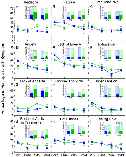 Prevalence and severity of headache (A), fatigue (B), limb/joint pain (C), anxiety (D), lack of energy (E), exhaustion (F), lack of appetite (G), gloomy thoughts (H), inner tension (I), reduced ability to concentrate (J), hot flashes (K) and feeling cold (L). Main panels: Values are means ± SD for n = 96 on Test (blue symbols and bars) and n = 95 on Control (green symbols and bars). Scr2 = second screening visit; Base = baseline; Week2 = week 2, Wk4 = week 4. * Prevalence significantly different from that at the Baseline visit by chi-squared test (p < 0.05). Insets: Percentage of participants in whom the symptom was more severe (dark bars) or less severe (light bars) than the severity before treatment (median severity at Scr2 and Base). The percent of participants with no change in severity is not shown. p-values are the significance of the difference between the ratio of M:L on Test vs. Control (p < 0.05 by Fisher’s exact test). * Ratio of M:L significantly different from 1:1 (p < 0.05 by binomial distribution) where M and L are the number of participants in whom the symptom was more severe (M) or less severe (L).