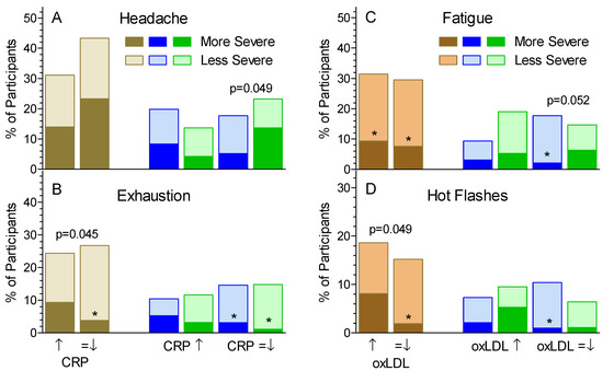 Effect of changes in serum CRP and oxLDL on symptom severity. Percent of participants whose symptoms became more severe (dark bars) or less severe (light bars) during treatment for those whose serum CRP (panels A and B) or oxLDL (panels C and D) increased (↑) or did not increase (=↓) after 4 weeks treatment. The percent of participants with no change in severity is not shown. Brown/orange bars are for all participants, blue bars for Test and green bars for Control. p-values over 2 bars are the significance of the difference between the ratios of More:Less severe for the 2 bars (e.g., panel A, in participants whose CRP did not increase after 4 weeks treatment, Headache was significantly more severe in those on Control vs. Test p = 0.049). * Ratio of more:less severe differs significantly from 1:1 by chi-square test (p < 0.05).