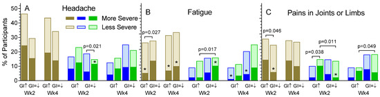 At baseline, 11 of the 12 non-GI symptoms were significantly more common at in the n = 88 participants with GI symptoms than in the n = 103 without GI symptoms (Table 1). Additionally, changes in the severity of GI symptoms during the trial were associated with differences in the severity of several non-GI symptoms. The overall severity of headache was not associated with the severity of GI symptoms at either 2 weeks or 4 weeks. However, at 2 weeks, headache was less severe on Test vs. Control in participants with no increase in the severity of GI symptoms (p = 0.021, Figure 4A). The overall severity of fatigue at 2 weeks was lower in participants whose GI symptoms became more severe compared to those in whom they did not (p = 0.027). The same was true for participants on the Control treatment (p = 0.017). However, the severity of Fatigue on Test treatment was not associated with differences in the severity of GI symptoms (Figure 4B). The overall severity of joint/limb pain was greater at 2 weeks in participants with more severe vs. the same or less severe GI symptoms (p = 0.046). The same was true for Control participants at 2 weeks (p = 0.011) and 4 weeks (p = 0.049) but not for Test participants (ns). At 2 weeks, the severity of joint/limb pain was lower on Test vs. Control in participants with more severe GI symptoms than at baseline (p = 0.038, Figure 4C).