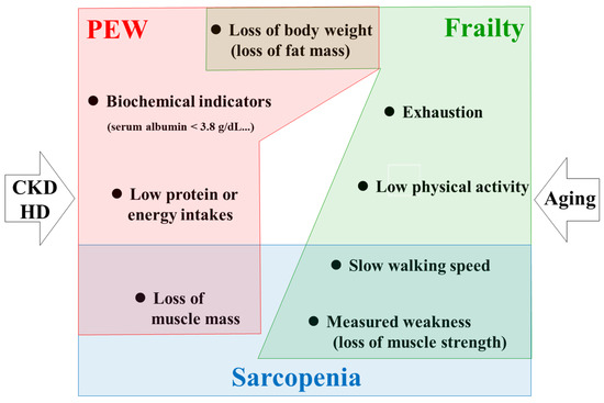 Conceptual overlapping among frailty, sarcopenia, and PEW. Aging accelerates frailty and sarcopenia. Advanced CKD/HD is profoundly associated with PEW. Elderly HD patients have the highest risk for these pathological conditions. Among these conditions, skeletal muscle derangement is a common component. CKD, chronic kidney disease; HD, hemodialysis; PEW, protein-energy wasting.