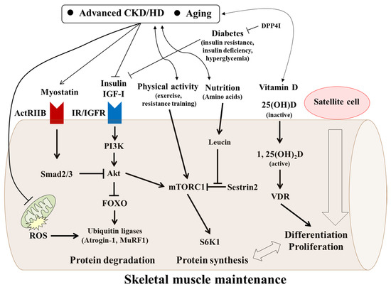 Various factors affecting skeletal muscle maintenance in aged patients with advanced CKD/HD. In aged patients with advanced CKD/HD, various factors have interaction with and transduce their effects intracellularly, thus affecting skeletal muscle maintenance. Insulin and IGF-I positively regulate skeletal muscle maintenance via binding of their cognate receptors. Subsequent activation of mTORC1 through PI3K/Akt is necessary for protein synthesis. Simultaneously, insulin-stimulated PI3K/Akt increases FOXO phosphorylation and subsequent inhibition of its translocation into the nucleus. On the other hand, myostatin, a negative regulator, binds to ActRIIB. Subsequent phosphorylation of Smad2/3 reduces Akt activation and decreases FOXO phosphorylation. Intranuclear translocated FOXO activates transcription of MuRF1 and Atrogin-1, which accelerates protein degradation via the ubiquitin-proteasome pathway. Defective mitochondrial quality control (derangements in fusion-fission) leads to ROS production and results in muscle protein degradation. Vitamin D is involved in muscle differentiation and proliferation by binding VDR, which is accompanied by interaction with muscle protein metabolism. Among amino acids, leucin activates mTORC1 by binding to Sestrin2, leading to protein synthesis. In addition, satellite cells, which can be modulated by the various aforementioned factors, may contribute to muscle maintenance. CKD, chronic kidney disease; HD, hemodialysis; ActRIIB, activin type II B receptor; IGF-I, insulin-like growth factor I; mTORC1, mammalian target of rapamycin complex 1; PI3K, phosphatidylinositol-3-kinase; FOXO, forkhead box O; MuRF1, muscle ring finger 1; ROS, reactive oxygen species; VDR, vitamin D receptor; DPP4-I; dipeptidyl peptidase 4 inhibitors.