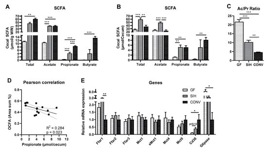 3.2. Cecal SCFA Pattern and Colonic Gene Expression Profile of Mice Harboring Different Microbial Status