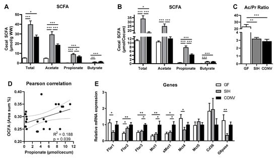 - Weitkunat, K.; Schumann, S.; Nickel, D.; Kappo, K.A.; Petzke, K.J.; Kipp, A.P.; Blaut, M.; Klaus, S. Importance of propionate for the repression of hepatic lipogenesis and improvement of insulin sensitivity in high-fat diet-induced obesity. Mol. Nutr. Food Res. 2016, 60, 2611–2621. [Google Scholar] [CrossRef] [PubMed]