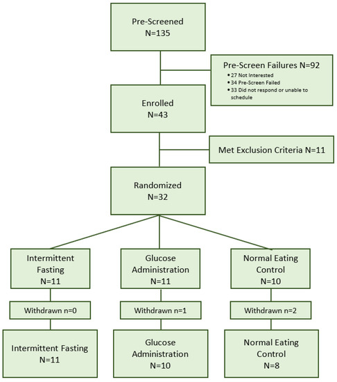 Participants were primarily recruited from posted advertisements in the community, other studies, and by word of mouth. A total of 135 community-dwelling adults were screened for eligibility. Of those, 34 were ineligible, 27 were not interested, and 33 did not respond or were unable to participate because of their schedule. Of the 43 individuals who completed the in-person screening assessment, 11 were excluded after further screening due to medication or health concerns. Thus, 32 participants were randomly assigned to the intermittent fasting group (n = 11), glucose administration group (n = 11), or normal eating control group (n = 10). Screening began in March of 2016 and concluded in December 2017. Recruitment was paused for a number of months during the study timeframe due to delays in access to EEG equipment as a result of a relocation of the lab to a new facility on campus. The study was concluded when the sample size to assess feasibility and acceptability for a pilot study was obtained.