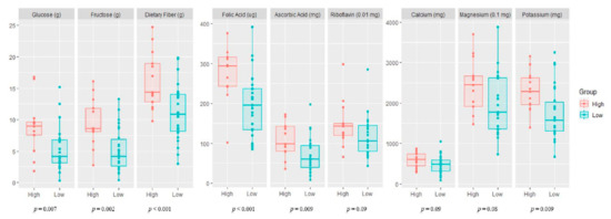 Maternal nutrient intake (macronutrients and micronutrients) in the high and low vegetable and fruit consumption groups during pregnancy is presented in Figure 1. The mothers with high fruit and vegetable consumption had a significantly higher intake of macronutrients (glucose, fructose, and dietary fiber), vitamins (folic acid and ascorbic acid), and minerals (potassium) than mothers with low fruit and vegetable consumption.