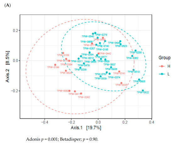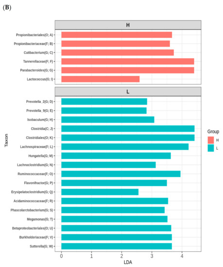 Variations in the infant gut microbiome at 2 months of age according to maternal fruit and vegetable consumption during pregnancy. (A) Principal coordinates analysis (PCoA) on unweighted unique fraction (UniFrac). (B) linear discriminant analysis effect size (LEfSe). The ordination is from A to W in a tree diagram (Figure S3). Definition of abbreviation: H, high maternal consumption of fruits and vegetables during pregnancy; L, low maternal consumption of fruits and vegetables during pregnancy; O, order; F, family; G, genus.