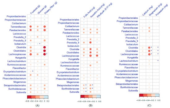 Heatmaps showing the correlation between maternal nutrient intake during pregnancy and the infant gut microbiome at 2 months of age (* Significant association). (A) Macronutrients. (B) Vitamins. (C) Minerals.