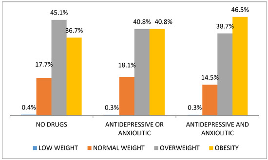 When analyzing the relationship between BMI and the consumption of the most prescribed psychotropic drugs in this population segment, we find that the average BMI values are higher (p = 0.02) in the subjects who simultaneously consume antidepressants and anxiolytics (BMI 29.7 95% CI 29.2–30.3) in comparison to the population who do not consume them (BMI 28.4 95% CI 28.6–29.1). As shown in Figure 1, the consumption of these drugs is associated with a higher prevalence of obesity.