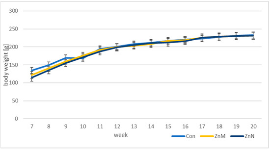 Both micro- and nanoparticles of zinc were administered via gavage in the dose of 4.6 mg/mL in 0.4 mL of water, started on the 40th day of life for 20 weeks. To ensure a similar stress level in all tested animals, the control group received 0.4 mL of water via gavage. Animals were gavage daily except Saturday and Sunday.