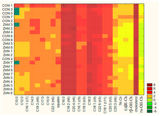 Among all fatty acids, SFA’s content ranged from 33% to 38% (Table 5), while on average, the lowest content of all saturated acids was found in the ZnN group and the highest in the ZnM group (Table 4). We discovered that the introduction of Zn in the diet resulted in lowering of the share of capric acid (C10:0), lauric acid (C12:0), myristic acid (C14:0) and hepatadecanoic acid (C17:0) in comparison to CON group. Moreover, supplementing the diet with Zn significantly contributed to the reduction of the percentage share of pentadecaenoic acid (C15:0) in group ZnM and ZnN, compared to the CON group. The highest levels of palmitic and stearic acid were determined in the ZnM group, respectively: 677.3 ± 145.6 μg/mL and 510.22 ± 76.5 μg/mL.
