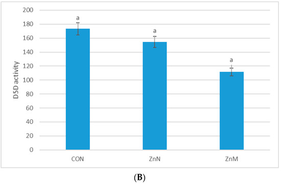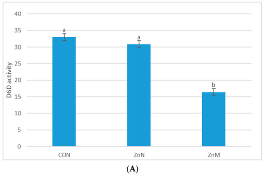 Activities of D6D (A) and D5D (B) in the serum of experimental groups. CON—control group; ZnN—group receiving zinc in nanoparticles; ZnM—group receiving zinc in microparticles. a,b—homogenous groups (α = 0.05), D6D–Δ6-desaturase index, D5D–Δ5-desaturase index.