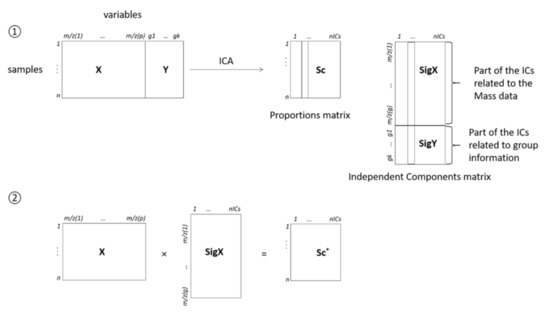 In the first step, the X and Y matrices are concatenated, and an ICA model is calculated on the obtained matrix. As explained earlier, ICA yields two matrices, namely a proportion matrix (Sc in Figure 1), which indicates the proportions in which each pure source signal is present in the considered experimental signal, and a signal matrix (Sig), which, in the case of ICDA, is equal to the concatenation of two different signal matrices related to the mass spectra (SigX) and to the group membership matrix (SigY), respectively. Investigation of the proportions of each IC can help in detecting the ICs that are discriminating one group versus the others. Investigation of the variables with high intensities (in absolute value) on a discriminating IC in SigX helps in detecting the important original (m/z) variables. Investigation of the variables with a high intensity in SigY helps to find out which group is discriminated against by the corresponding IC, which can also be seen on the proportion plots. Yet, these proportions have been calculated by using both the information from X and from Y, and it is highly probable that the information in Y enhances the observed discrimination. Therefore, in step 2, new proportions are calculated (Sc *) by projecting the X matrix only on the SigX signals, i.e., by using only the information from the mass spectra. The new proportions obtained are more realistic; they can be plotted, and if a discrimination can still be observed, it means that there is information in the (urine or plasma) samples which is related to the amount of ingested proteins.