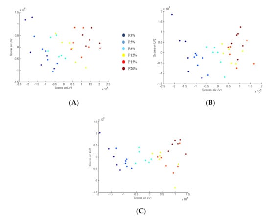 PLS Analysis for the data obtained by LC-MS characterizing the discrimination of the predefined groups to discriminate protein content diet based on IC1 and IC2 in urine (A), portal vein (B), and vena cava (C).