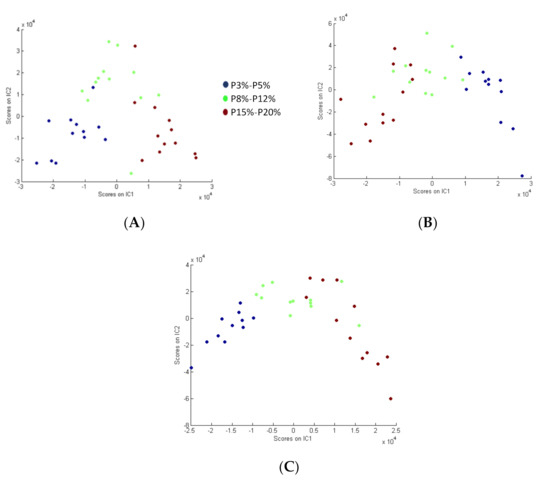 ICDA [16] is a method derived from independent components analysis (ICA). In order to apply ICA, one has to assume that the experimental data are equal to a linear combination of pure component signals. With only the experimental data at hand, ICA aims at finding both the pure sources as well as the proportions of these sources in each of the experimental signals. The pure components are obtained in a so-called “signal matrix” (equivalent to the loadings matrix in PCA), while the proportions are obtained in a “proportions matrix” (equivalent to the scores matrix in PCA). The ICDA method combines the power of ICA to obtain pure interpretable components with the inclusion of information about the samples (group membership, i.e., indication of the group to which each sample belongs) in the model in order to orient the ICs towards discrimination. This method has been successfully used in a number of studies [16,17]. Here, it has been applied by splitting the samples into 3 groups: (1) very low protein concentrations (P3 and P5); (2) low protein concentrations (P8 and P12); and (3) normal protein concentrations (P15 and P20). The use of three groups rather than 6 groups (one per concentration) has been made after a careful data inspection, where it could be seen that 3 groups were likely to yield a better discrimination than 6 groups. A schematic presentation of ICDA is presented in Figure 1.
