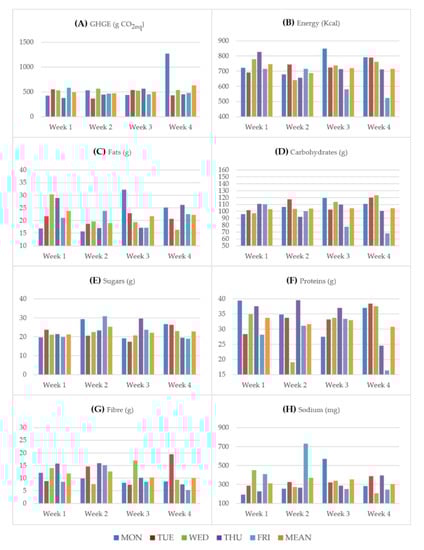 Carrots, which contain a high quantity of sugar compared to other vegetables, are responsible for the peaks observed on the second (Monday and Friday) and third (Thursday) weeks. Figure 1F shows the distribution of proteins. The second week (Wednesday) and the fourth week (Friday) have the lowest quantities of protein because on these days only 1 egg is considered as the second course. This corresponds to a small portion that compensates for the relatively high content of proteins in the eggs. Cheese is another possible second-course providing fats and lowering the quantity of protein (Friday of the fourth week). The two relevant peaks of proteins on Monday of the first week and Thursday of the second week are due to the presence of legumes with pasta as the first course, and meat as the second course. In general, the presence of legumes is responsible for a high quantity of proteins also on the other days (e.g., Thursday on the first week and Tuesday on the fourth week) even though legumes represent proteins from a vegetable source. In addition to that, legumes are also an important contributor to the fibre content of the proposed menu (Figure 1G), as shown by the two peaks in the third and fourth week (Wednesday and Tuesday, respectively).