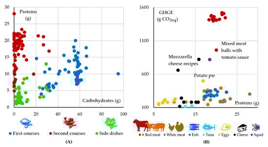 (A) Carbohydrate and protein contents of the recipes; (B) protein contents and GHGE of the second-course recipes.