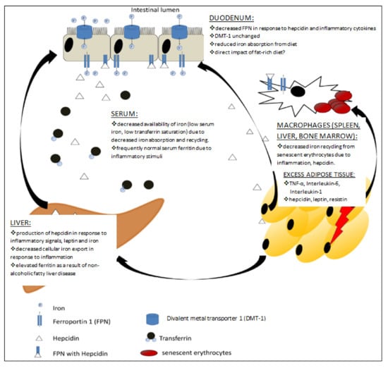 Interplay between obesity and iron metabolism. Figure adapted from Aigner et al. [82].