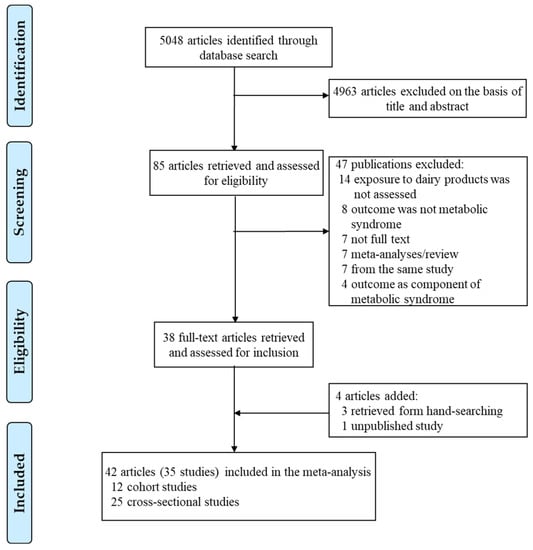Four meta-analyses on dairy consumption and MetS risk have been previously conducted [6,7,8,9]. Two meta-analyses were mainly conducted on total dairy consumption [6,7], while the other two meta-analyses reported some results of individual dairy products but did not conduct subgroup analyses of individual dairy products [8,9]. Previous studies did not perform stratified analyses by sex and criteria for MetS, and previous meta-analyses pointed out the different MetS criteria as a limitation [7,8,9]. In addition, there were some observational studies on cheese consumption and risk of MetS, but no meta-analysis of cheese consumption on risk of MetS has been conducted to date. Also, we need to conduct an updated meta-analysis of observational studies with the most recent data and dose-response analyses.