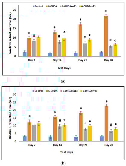Protective effects of α- and γ-T3 supplementation on (a) Forelimb retraction time (FRT) latency and (b) Hindlimb retraction time (HRT) latency compared to that in the 250 µg 6-OHDA-induced parkinsonism group (6-OHDA group). (n = 6; * p < 0.05 vs. control; # p < 0.05 vs. 250 µg 6-OHDA; ° p < 0.05 vs. 250 µg 6-OHDA).