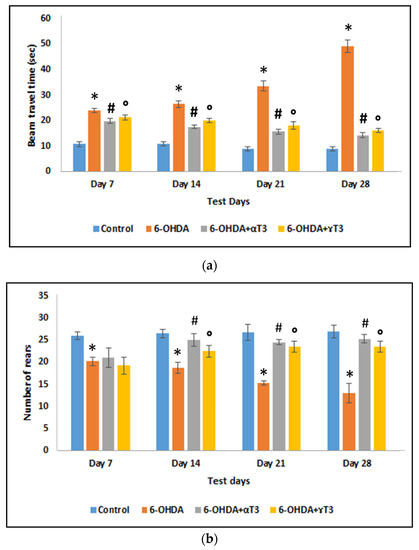 The beam travel time (Figure 2a) of SD rats injected with 250 µg 6-OHDA significantly increased on all test days compared to that of the respective control group. The beam travel time gradually increased as the days progressed from day 7 to day 28, indicating motor impairment caused by 6-OHDA neurotoxicity. In contrast, the α-T3 (6-OHDA+α-T3) supplemented groups showed a significant decrease in the beam travel time on all test days compared to that of the 6-OHDA group. Whereas the γ-T3 (6-OHDA+ γ-T3) supplemented group showed a significant decrease in the beam travel time on the test days 14 to 28 compared to the that of the respective 6-OHDA group. The protective effect of T3 supplementation was evident as the beam travel time decreased with each passing week.