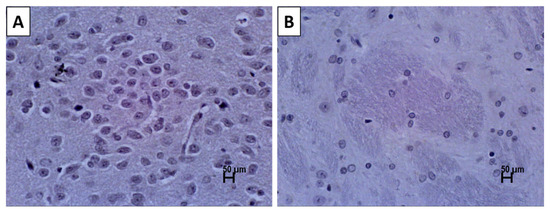 Photomicrographs showing the immunohistochemistry (IHC) without primary antibody for tyrosine hydroxylase (TH) in the coronal sections of (A) substantia nigra without detectable dopamine (DA) neurons, and (B) striatum without detectable DA fibres. Scale bar: 50 µm.