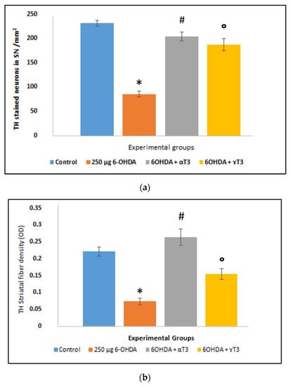 Bar chart representing the (a) average number of tyrosine hydroxylase (TH)-immunostained dopamine neurons in the substantia nigra, and (b) TH-immunostained striatal fibre density (optical density (OD)) quantified using ImageJ. (n = 6; * p < 0.05 vs. control; # p < 0.05 vs. 250 µg 6-OHDA; ° p < 0.05 vs. 250 µg 6-OHDA).