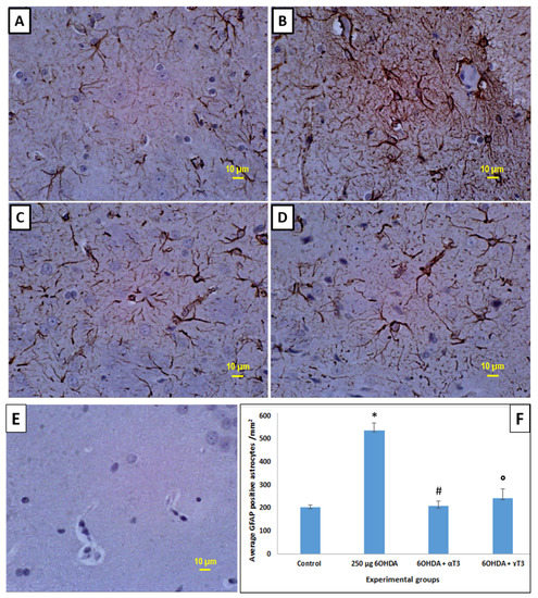 Photomicrographs showing the expression of glial fibrillary acidic protein (GFAP) in striatum (STR) from the (A) control group, (B) 250 µg 6-OHDA-injected group, (C) 250 µg 6-OHDA + α-T3-treated group, (D) 250 µg 6-OHDA + γ-T3-treated group, and (E) negative control without primary antibody for GFAP and (F) bar chart showing the quantification of GFAP positive astrocytes in STR of A–D. (Scale Bar: 10 µm; n = 6; * p < 0.05 vs. control; # p < 0.05 vs. 250 µg 6-OHDA; ° p < 0.05 vs. 250 µg 6-OHDA).