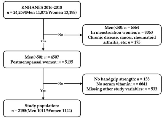 A total of 24,269 participants were enrolled in KNHANES VII (2016–2018). Of these participants, 11,071 were men and 13,198 were women. Since sarcopenia is known to start mainly in people in their 50s [7,21], we selected from this population men aged ≥50 years (n = 4507) and postmenopausal women (n = 5135). A self-reported questionnaire was used to select the postmenopausal women. People without data for serum vitamin E or HGS were excluded, leaving 2863 participants. People without additional data needed for statistical analyses were further excluded, leaving 2330 participants. These data include height, weight, smoking habits, drinking habits, serum high-sensitivity C-reactive protein (hsCRP) levels, fasting serum glucose levels, total cholesterol levels, educational status, household income, frequency of resistance exercise, use of dietary supplements, and comorbidities such as diabetes, hypertension, and anemia. People with systemic diseases such as various cancers, rheumatoid arthritis, stroke, liver cirrhosis, and kidney failure were excluded from the study population leaving 2155 people. Finally, 2155 people participated in the study; 1011 were men and 1144 were women (Figure 1).