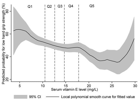 A non-linear probability for low HGS was fitted against serum vitamin E level in Figure 2. The probability of low HGS was elevated in the lowest quintile range (Q1, <10.51 mg/L), whereas the probability of low HGS remained stable across the mid-quintiles (Q2 to Q4), with a U-shaped association at the highest quintile (Q5).