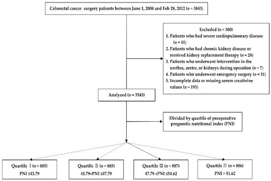 However, to our knowledge, no studies have evaluated the association between preoperative PNI and postoperative AKI development in colorectal cancer patients. Therefore, this study was performed to evaluate the association preoperative PNI and postoperative AKI in patients who underwent colorectal cancer surgery. We also assessed hospital days, postoperative intensive care unit (ICU) admission and complications, and 1-year and overall mortality.