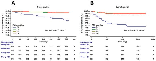 Figure 2 shows the Kaplan–Meier curve according to preoperative PNI level quartiles (log-rank test; p < 0.001). The 1-year and overall survival were significantly different between the PNI level of quartile 1 group and PNI level of quartile 2, 3, and 4 groups. Supplementary Figure S1 shows the Kaplan–Meier curve of postoperative AKI as defined by KDIGO criteria.