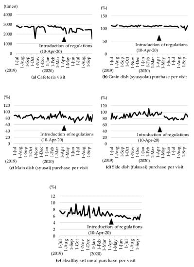 The workplace cafeteria visits and dishes purchased per cafeteria visit from 1 July 2019 (Week 1) to 30 September 2020 (Week 66) are shown in Figure 1. The number of visits to the workplace cafeteria decreased slightly after the introduction of the regulations (Figure 1a). Some steep declines were due to the absence of the factory’s work schedule. Taking into account the number of visits to the workplace cafeteria, the purchase of main and side dishes decreased after the regulations were introduced, but the purchase of grain dishes was less affected (Figure 1b–d). The purchase of healthy set meals also decreased after the introduction of the regulations (Figure 1e).