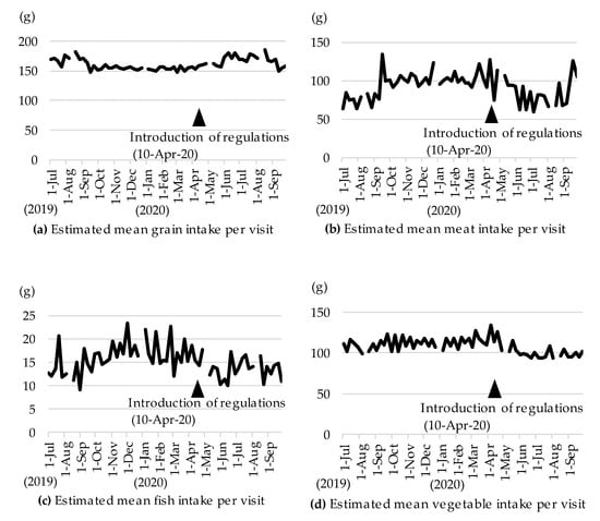 The change in the estimated mean food intake per visit is shown in Figure 2. The estimated mean grain intake increased and the estimated mean meat, fish, and vegetable intake decreased after the introduction of the regulations. As for the trend throughout the study period, the estimated mean grain intake tended to be high from spring to summer and low from autumn to winter; in contrast, the estimated mean meat and fish intake tended to be low from spring to summer and high from autumn to winter.
