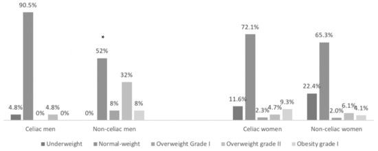 Celiac men presented lower weight, lower body fat, and lower BMI when compared to their non-celiac counterparts. In the women’s group, significant differences are only observed when comparing body fat, which was higher in celiac women (Table 6). There were no significant differences in height. Figure 1 shows the classification of weight status according to body mass index (BMI). In the group of celiac men, a significantly higher proportion of subjects fell in the BMI range classified as normal weight, as well as in the underweight group, as compared to non-celiac. In the non-celiac group, a significantly higher proportion of subjects was found in the ranges of overweight grade I, overweight grade II, and obesity. For women, the proportion of celiac women in the normal-weight range was higher than in the non-celiac group, whilst a higher proportion of non-celiac women were classified in the underweight category (Figure 1).